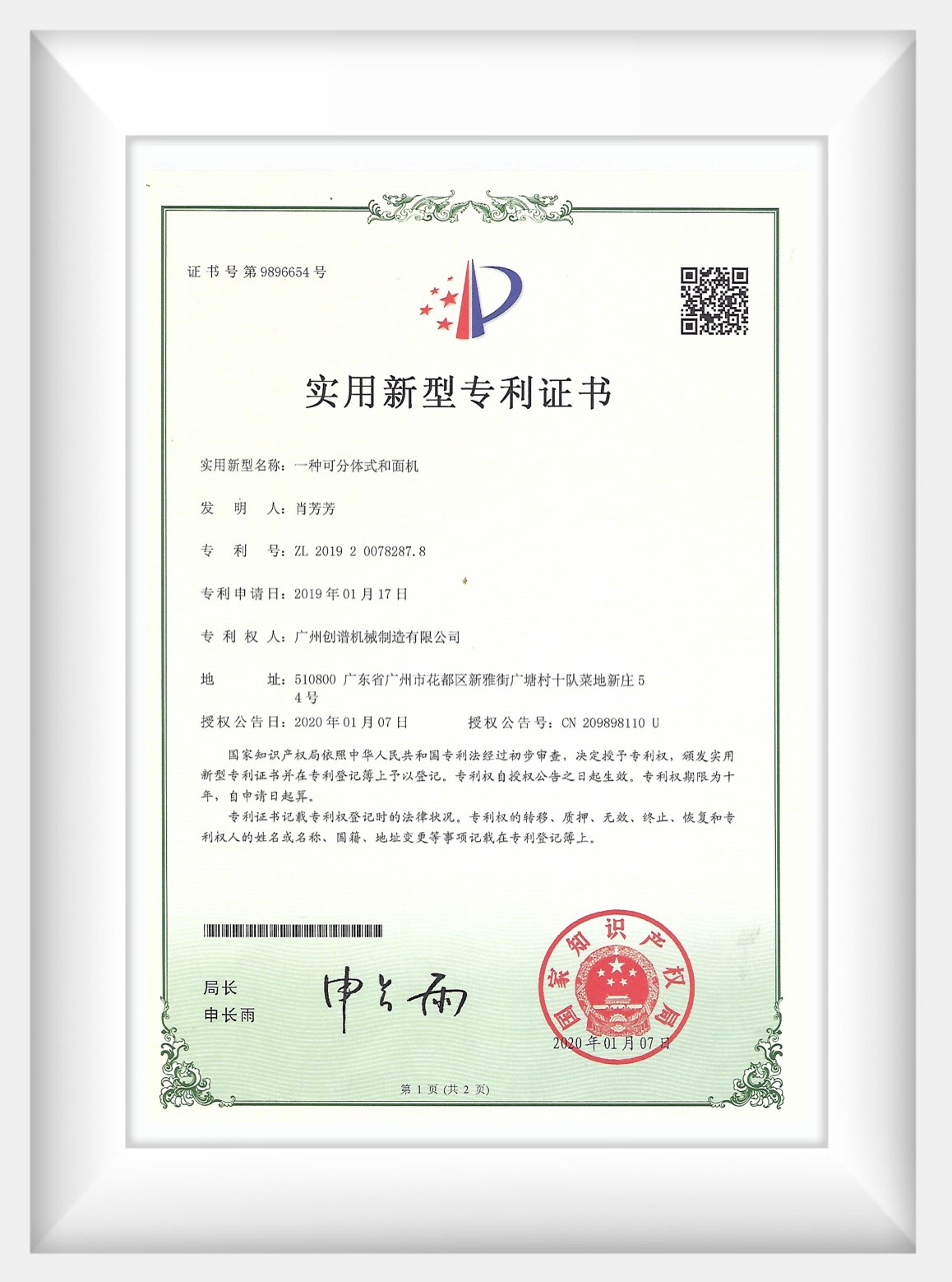 Dough Mixer Machine - Utility Model Patent Certificate