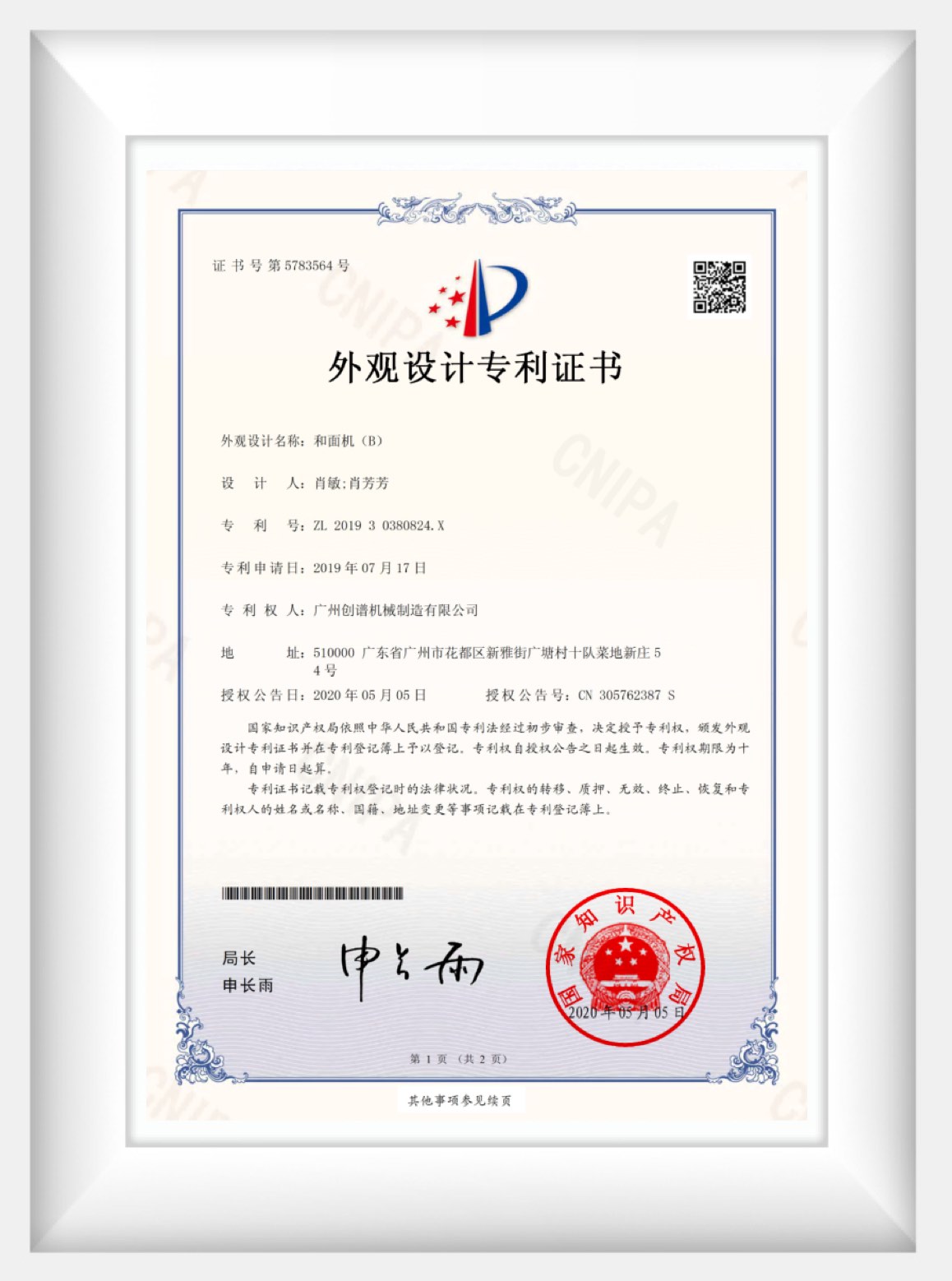 Appearance Design Patent Certification of Dough Mixer Machine 2018